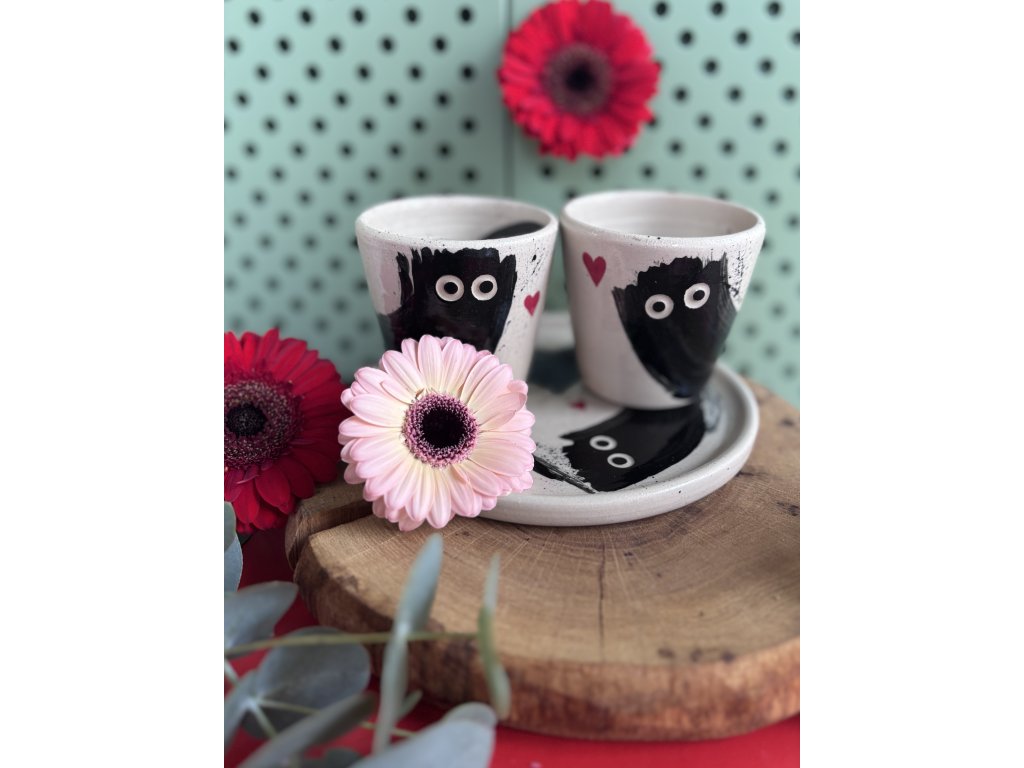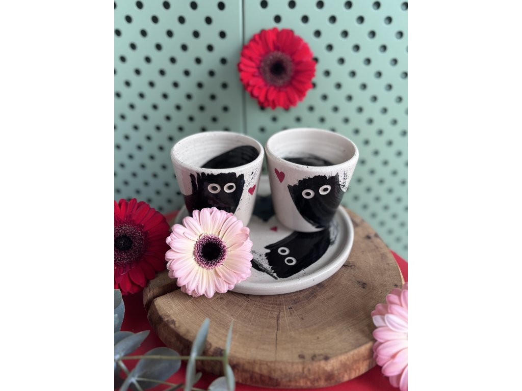 Dva kelímky v sadě s dezertním talířkem. Je na Vás, zda na něm naservírujete kávu pro dva bez strachu z koleček na ubrusu nebo talířek využijete na dortík či sušenky...