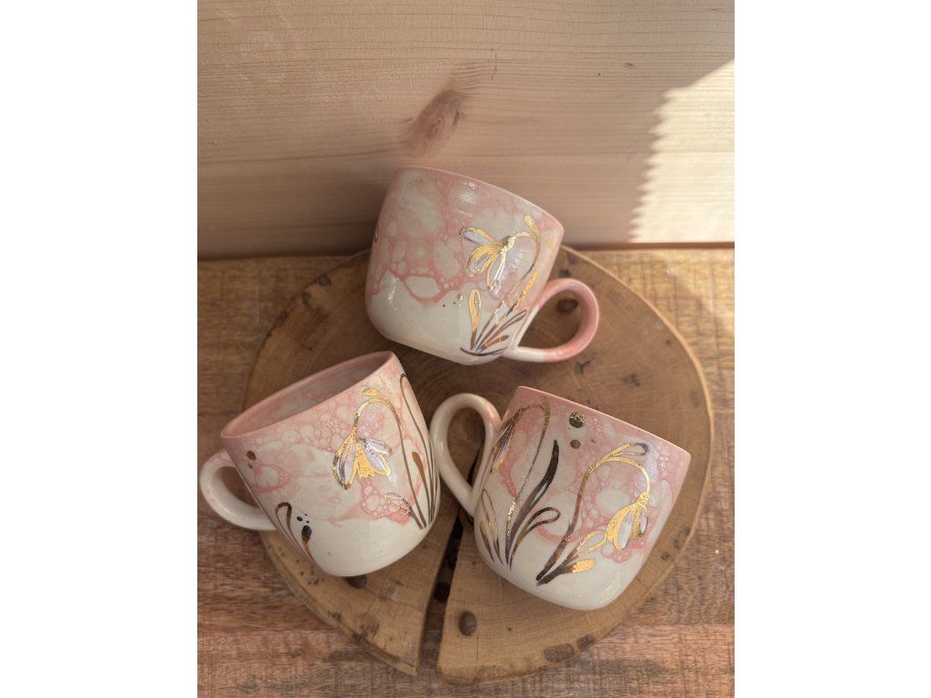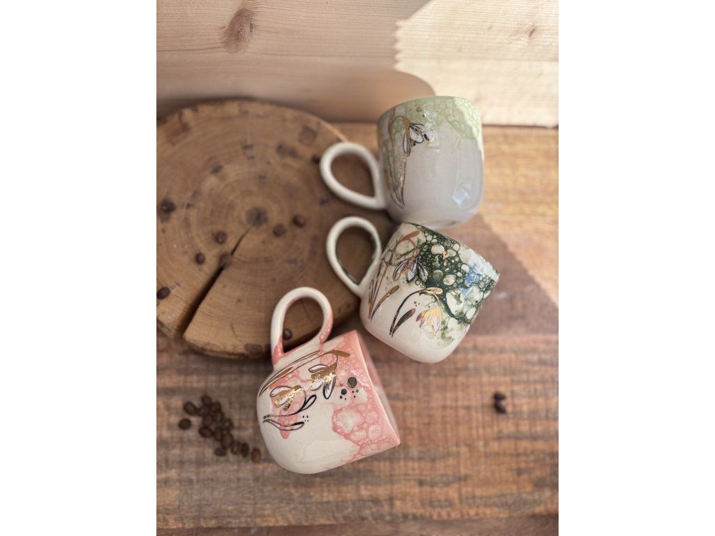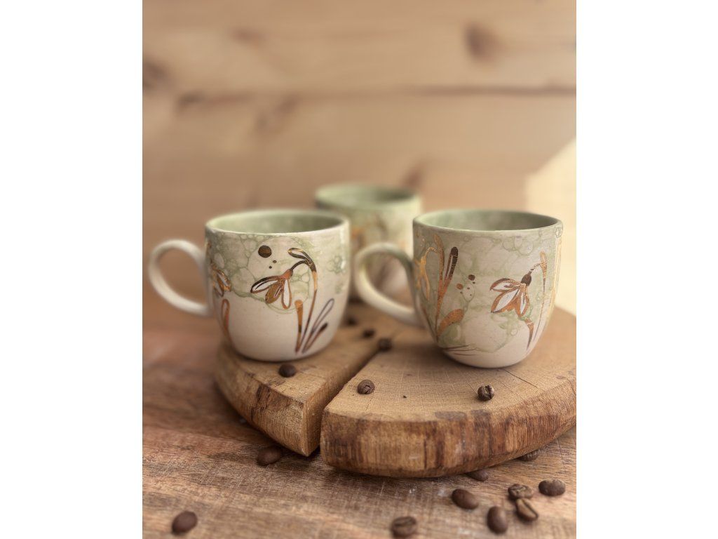 Sněženky na každém hrnku rostou trochu jinak. Liší se jejich počet, rozmístění i drobné detaily – stejně jako v přírodě. Každý kus je originál.