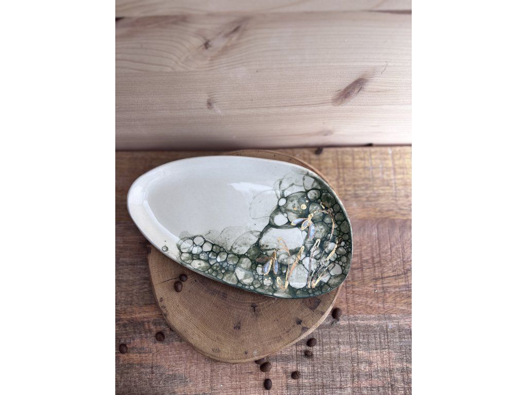 Každý kus je tvarovaný ručně z kameniny pálené na více než 1200 °C. Díky tomu je pevný a připravený na každodenní používání. Motiv sněženek je ručně malovaný zlatem a pálený ve třetím výpalu- jemný detail, který zachytí světlo a pokaždé trochu jinak zazáří. Nemá rád myčku a už vůbec ne mikrovlnku.