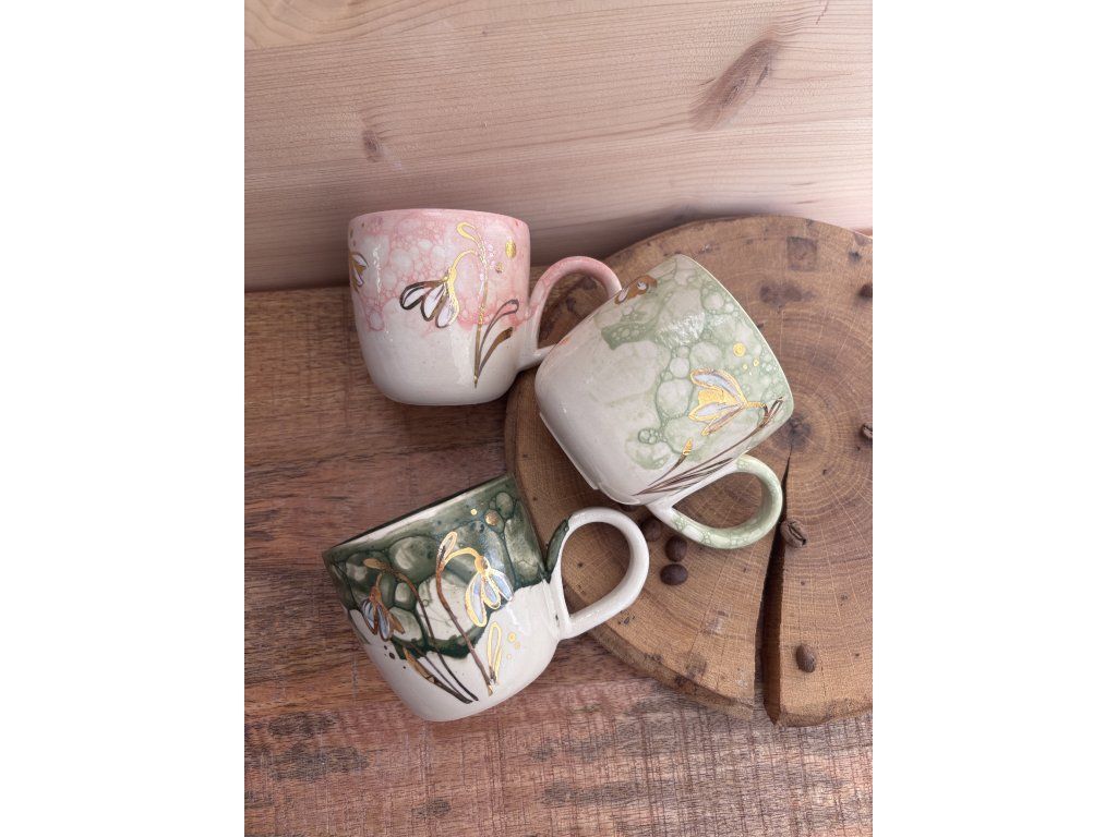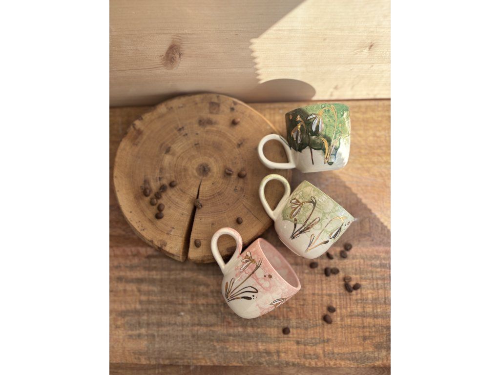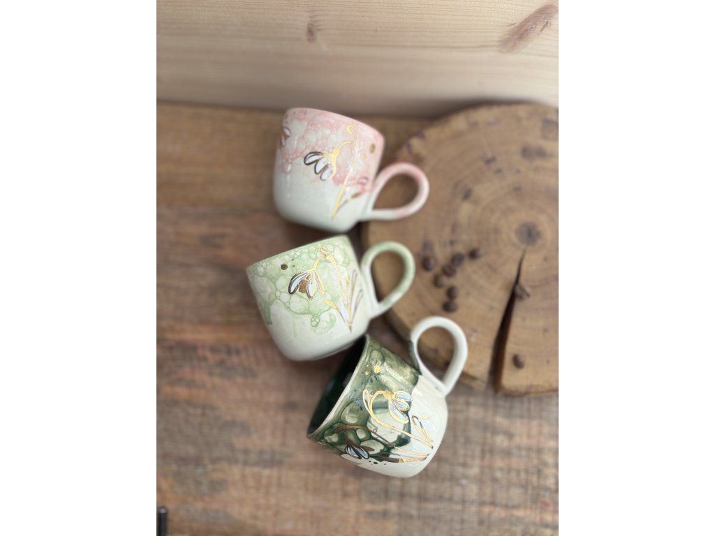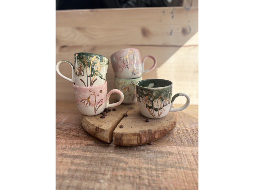 Sněženky na každém hrnku rostou trochu jinak. Liší se jejich počet, rozmístění i drobné detaily – stejně jako v přírodě. Každý kus je originál.